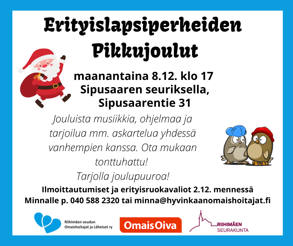 Tapahtuma on maksuton. Ilmoittautumiset 20.11. mennessä p.040 588 2320 minna@hyvinkaanomaishoitajat.fi Järj. Riihimäen seudun Omaishoitajat ja Läheiset ry yhdessä Riihimäen Erityiset ry:n kanssa.