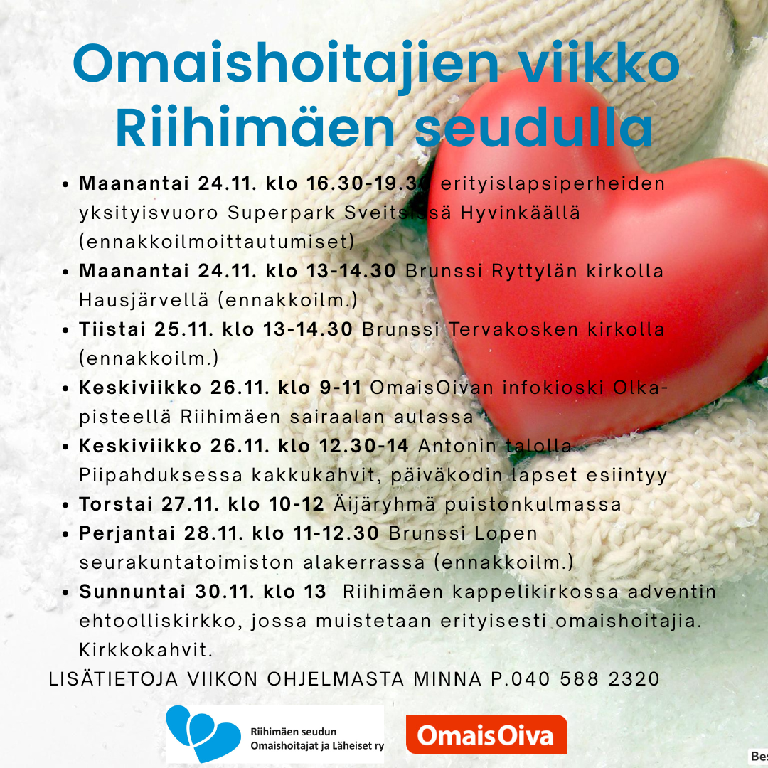 Viikolla 48 vietetään valtakunnallista omaishoitajien viikkoa teemalla "Yhdessä enemmän". Viikon aikana myös Riihimäen seudulla omaisestaan tai läheisetään huolehtiville järjestetään kohtaamisia ja…