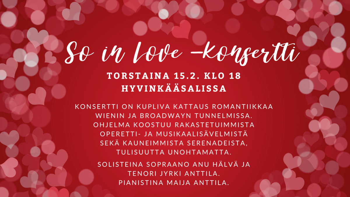 SO IN LOVE - konsertti on kupliva kattaus romantiikkaa Wienin ja Broadwayn tunnelmissa. Ohjelma koostuu rakastetuimmista operetti- ja musikaalisävelmistä sekä kauneimmista serenadeista, tulisuutta unohtamatta. Ohjelmistossa on mm. Itke en lemmen tähden, Kuumat suudelmat, Tassilon aaria Kreivitär Mariza -operetista, duetto musikaalista West side story Tonight, All I ask for you Opperan kummituksesta, I dreamed my dream musikaalista Miserable ja monia monia muita unohtumattomia sävelmiä. Solisteina sopraano Anu Hälvä ja tenori Jyrki Anttila. Pianistina konsertissa toimii Maija Anttila.